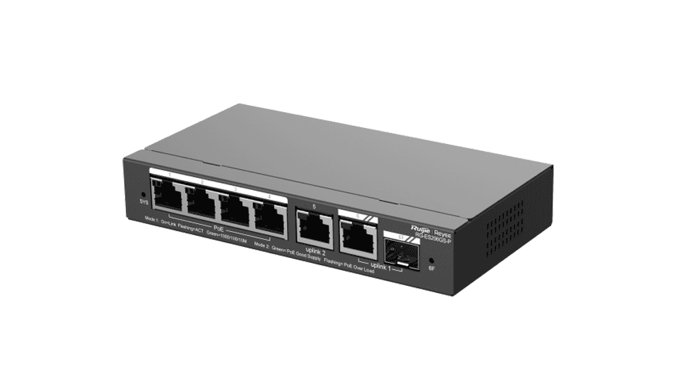 RG-ES206GS-P - Cloud მართვადი PoE სვიჩი, 4xG PoE+, 2x1G და 1xSFP პორტით, 54W PoE